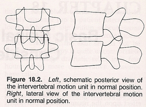 The biomechanical efficiency of any one of the 25 vertebral motor units, from atlas to sacrum, can be described as that condition (individually and collectively) in which each gravitationally dependent segment above is free to seek its normal resting position in relation to its supporting structure below, is free to move efficiently through its normal ranges of motion, and is free to return to its normal resting position after movement. The motor unit has an anterior and a posterior portion, and each has peculiar characteristics; the articulations are actually the mobile or motor portion of the unit:
