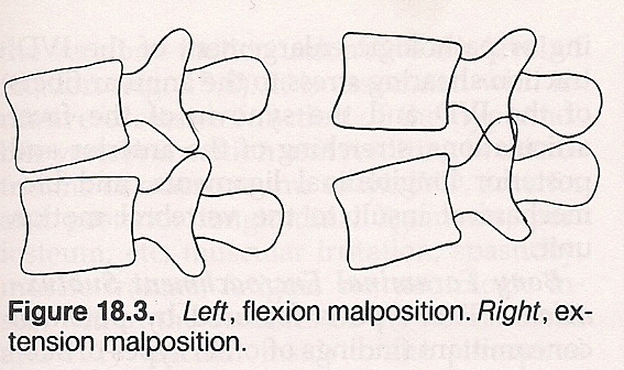 Flexion Subluxation. This is characterized by approximation of the vertebral bodies at the anterior and by separation of the vertebral bodies, facets, and spinous processes at the posterior. When found, it is indicative of irritative microtrauma to the anterior intervertebral foramen (IVF); forced excursion of the nucleous pulposis and bulging of annular fibers; stretching of the posterior longitudinal, interspinal, and supraspinal ligaments; traction shearing stress of the synovia of the facet articulations; and biomechanical impropriety of the motor unit.