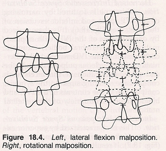 When the spine is in a neutral standing or sitting position, the anterior surface of a vertebral body will rotate to the side opposite the lateroflexion with the vertebral bodies tending to crawl out from under the load. This pattern of function usually takes place within multiple spinal segments, but dysfunction will occur when ligaments and muscles attached to and affecting the vertebral articulations are shortened or lengthened to effect restricted or excessive motion of one or more segments. The articular facets open during flexion, close during extension, and individual segments rotate and side bend to the same side. When the neutral position is resumed, the spinal joints should return to their "normal" position.