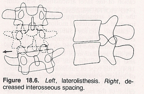 Laterolisthesis Subluxation. This is characterized by lateral, superior, and posterior excursion of the vertebral body on the side of deviation and by separation of the facets on the side of deviation with reverse torsion and approximation on the side opposite deviation. This suggests irritative microtrauma to the IVD on the side opposite deviation, lateral and posterior shearing stress to the annular fibers on the side of deviation, imbrication of facets and anterior shearing of the synovia on the side opposite deviation, and biomechanical insult to the vertebral motor unit.
