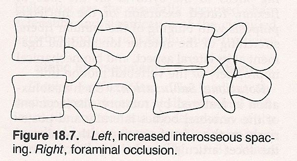Increased Interosseous Space Subluxation. This is characterized by superior excursion of the vertebral body and the facets. It results in inflammatory swelling or pathologic enlargement of the IVD, traction shearing stress to the annular fibers of the IVD and the synovia of the facet articulations, stretching of the anterior and posterior longitudinal ligaments, and biomechanical insult to the vertebral motor unit.