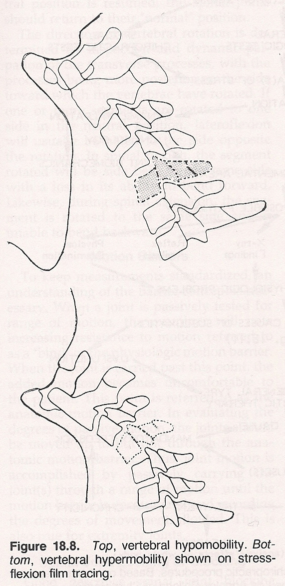 Hypomobility and/or Fixation Subluxation. This common subluxation is characterized by fixation of the vertebral motor unit in relation to the supporting structure below and compensatory hypermobility of the vertebral motor unit above the level of fixation. It is associated with irritative excessive function of the hypermobile vertebral motor unit resulting in microtrauma or macrotrauma to the IVD, anterior and posterior longitudinal ligaments, periosteum, etc; muscular irritation, spasticity, muscle trauma, fatigue, etc; neurologic insult within the confines of the neural canal and IVF; vascular insult to the paraspinal and interforaminal blood vessels; and biomechanical impropriety of all vertebral motor units involved.