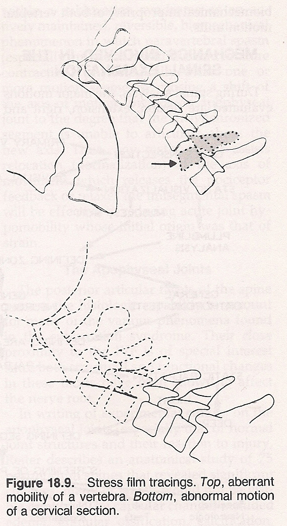 Good describes spinal joint blocking within a subluxation syndrome as an actively maintained, reversible, biomechanical phenomenon in which paravertebral spasm (especially unilateral multifidus and rotatore contraction) physiological- ly locks one or more motion segments, causing a shift of the axes of motion towards an apophyseal joint to the degree that the unsynchronized segment is unable to articulate about the new axis. Thus, any method that assists reloca=- tion (normalization) of the axes of movement, which releases the nociceptor feedback, or relaxes the unisegmental spasm will be effective in reducing acute joint hypomobility whose initial origin was that of strain.
