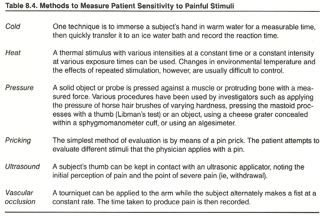 The pain threshold and tolerance of a patient are frequently determined in general practice by(1) pricking the skin with a pin or