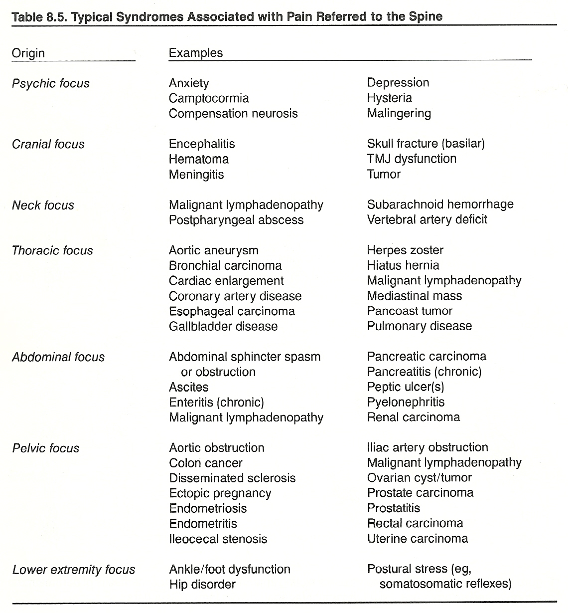 Common syndromes that are known to refer pain to the spine are listed in Table 8.5.