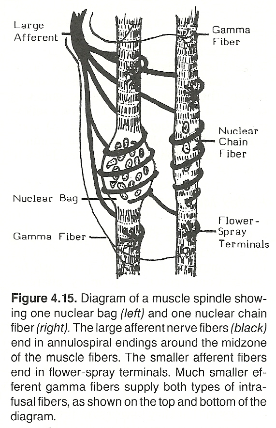The gamma (fusiform) motor neurons regulate the sensitivity of the spindle system by directing the shortening of the modified intrafusal muscle fibers. These fibers are in series with the central-receptor aspects of the spindles. As with alpha motor neurons, gamma fibers receive signals of many types and from various sources, including each other and the alpha motor neurons. It should be pointed out, however, that this complex segmental apparatus is only the lowest aspect of a highly integrated CNS system for central motor control.