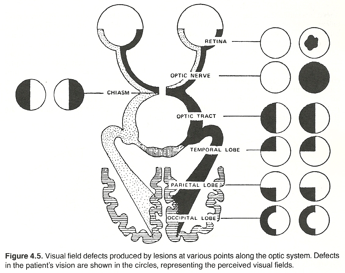 Unilateral lesions of the optic tract, lateral geniculate bodies, or optic radiations manifest as homonymous defects in the field of vision of one or both eyes, depending on whether the lesion is partial or complete. Lesions of the optic tract anterior to the optic chiasm produce a defect of vision in only one eye.
