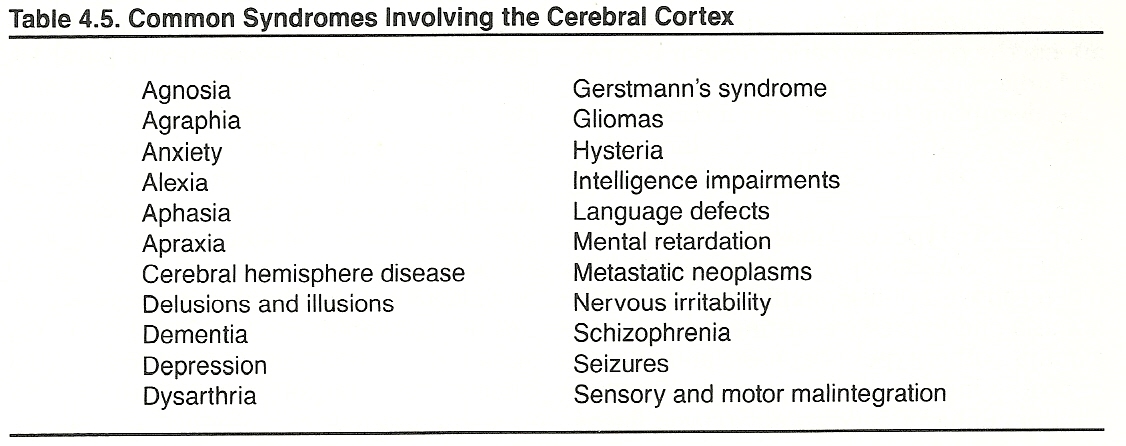 Other common tests can be used in suspected agnosia, alexia, apraxia, and aphasia. Refer to Table 4.3. Kinetic apraxia is characterized by an inability to perform precise acquired motor movements in the absence of paresis due to lesions involving the precentral cortex.