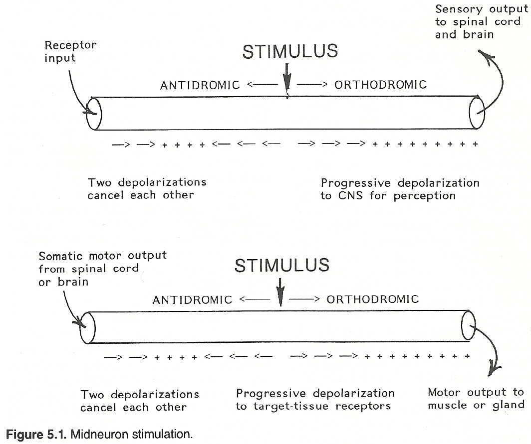 The antidromic impulses, in the sense of going against "normal traffic," interfere with conduction of true sensory information that is being generated at the receptor. In such a situation, the depolarization of antidromic impulse meets the depolarization of the true impulse and cancels both transmissions. Unimpeded antidromic impulses reaching the receptor terminals do not produce resultant changes or effects, simply because they are receptor organs and not effector organs.