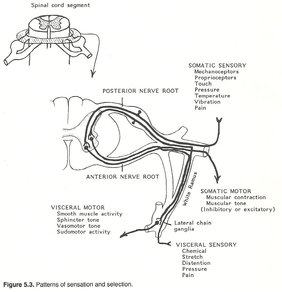 Somatosensory neurons are those afferent fibers that carry sensory information to the cord from all somatic structures innervated by that cord segment; particularly, dermal sensations, muscle stimuli, and musculoskeletal-related proprioceptive sensations of motor activity, vibration, and position. Somatomotor neurons are those efferent fibers that innervate skeletal muscles at a given cord level and control tonus or contraction of the related somatic elements.