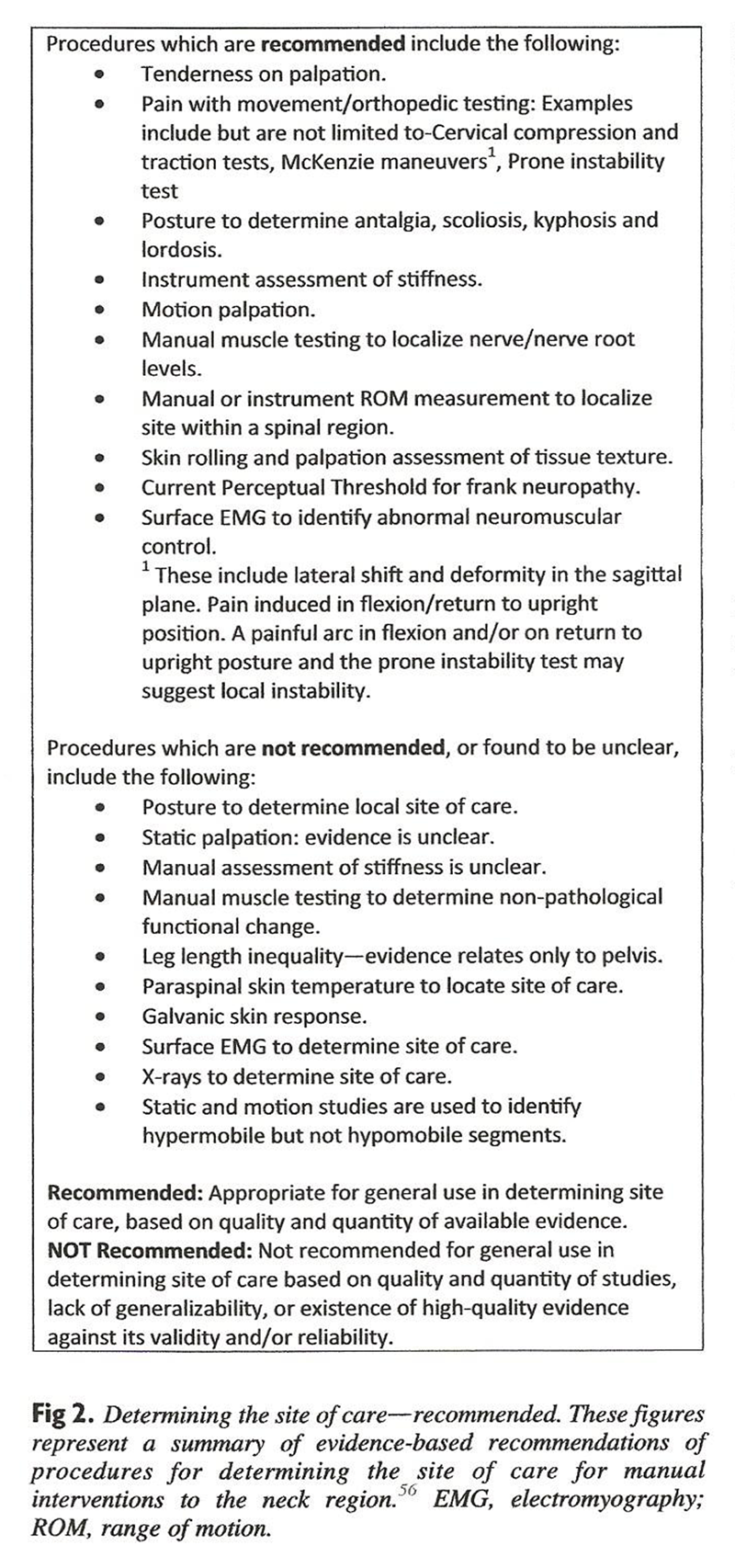 RESULTS:        The statements and concepts covered aspects of the clinical encounter, ranging from informed consent through diagnosis, assessment, treatment planning and implementation, and concurrent management and referral for patients presenting with neck pain.