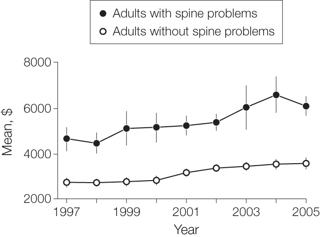 DESIGN AND SETTING:        Age- and sex-adjusted analysis of the nationally representative Medical Expenditure Panel Survey (MEPS) from 1997 to 2005 using complex survey regression methods. The MEPS is a household survey of medical expenditures weighted to represent national estimates. Respondents were US adults (> 17 years) who self-reported back and neck problems (referred to as "spine problems" based on MEPS descriptions and International Classification of Diseases, Ninth Revision, Clinical Modification definitions).