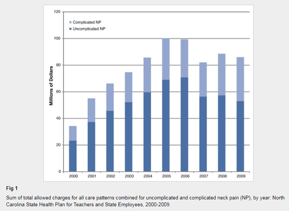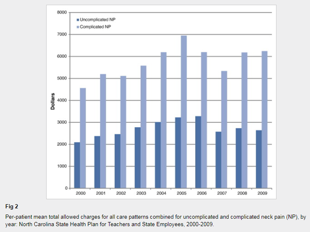 METHODS: This was an analysis of neck-pain-related closed claim data from the North Carolina State Health Plan for Teachers and State Employees (NCSHP) from 2000 to 2009. Data were extracted from Blue Cross Blue Shield of North Carolina for the NCSHP using ICD-9 diagnostic codes for uncomplicated neck pain (UNP) and complicated neck pain (CNP).