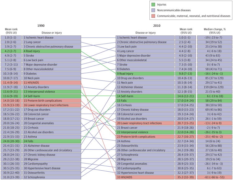 Combining YLLs and YLDs into DALYs provides a summary metric of the leading contributors to health loss. In 1990, 40% of DALYs were due to YLDs increasing to 45% in 2010. Figure 2 shows the rank of the leading diseases and injuries contributing to DALYs in 1990 and2010. Communicable, maternal, neonatal, and nutritional disorders are red, noncommunicable causes are blue, and injuries are green. Diseases and injuries are connected by lines between 1990 and 2010. The top 15 diseases and risk factors contributing to DALYs are a complex mix of cardiovascular diseases (ischemic heart disease and stroke), musculoskeletal disorders (low back pain, other musculoskeletal disorders, and neck pain), 1 cancer type (lung), mental and behavioral disorders (major depressive disorder, drug use disorder, and anxiety), COPD, diabetes, and 3 injury types (road injury, self-harm, and falls) (Figure 2). Of the 30 leading diseases and injuries contributing to DALYs, 10 (COPD, major depressive disorders, other musculoskeletal, diabetes, drug use disorders, Alzheimer, falls, cirrhosis, CKD, and osteoarthritis) increased by more than 30% from 1990 to 2010 (eTable 6 in the Supplement provides detail for the 272 diseases and injuries). Other disorders contributing to DALYs not in the top 30 that have also increased by more than 30% in the past 2 decades include liver cancer, atrial fibrillation, kidney cancers, eating disorders, and poisoning.