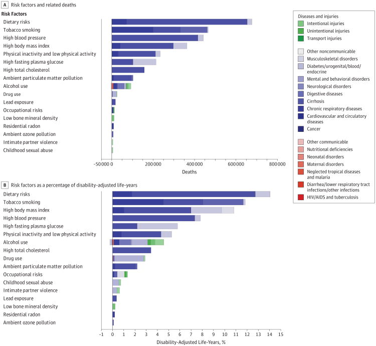 Figure 3 shows the number of deaths and the percentage of DALYs related to the 17 risk factors or risk factor clusters in 2010 each of which was associated with more than 0.1% of DALYs. The largest cluster of risk factors was the composition of diet, which was associated with 26% of deaths and 14% of DALYs (Figure 3). The overall composition of diet is made up of an analysis of 14 components of diet (eTables 7 and 8 in the Supplement provide further details for risks or clusters of risks for DALYs and associations with deaths, respectively). The most important dietary risks in the United States are diets low in fruits, low in nuts and seeds, high in sodium, high in processed meats, low in vegetables, and high in trans fats.