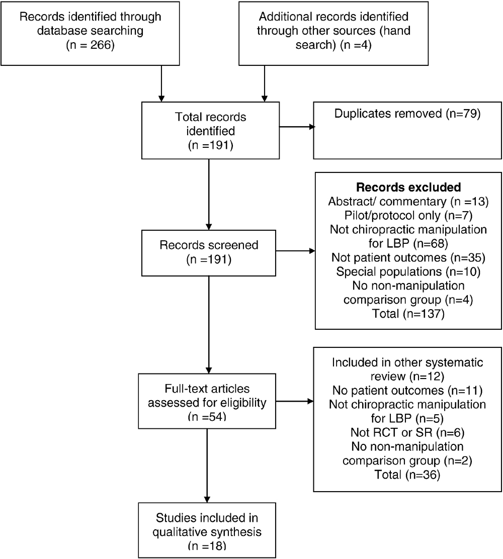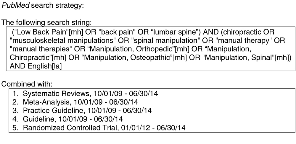 The following databases were included in the search: PubMed, Index to Chiropractic Literature, CINAHL, and MANTIS. Details of the strategy for each database are provided in Figure 1. Articles and abstracts were screened independently by 2 reviewers. Data were not further extracted.