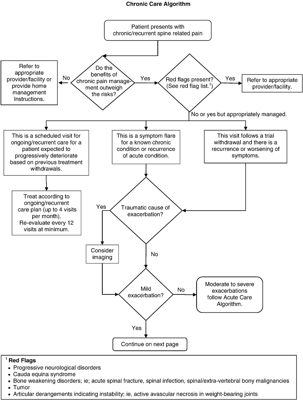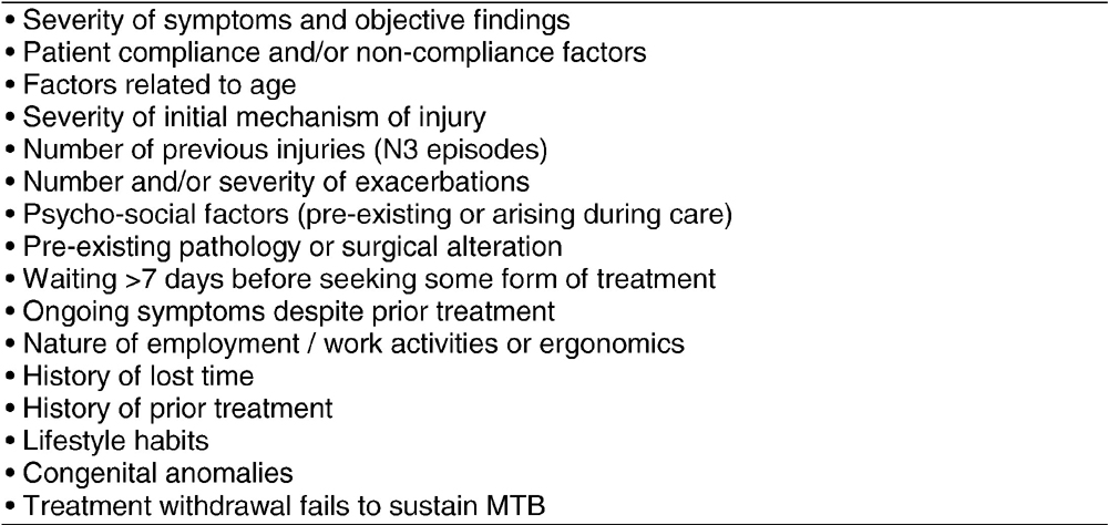 Most acute pain, typically the result of injury (micro- or macrotrauma), responds to a short course of conservative treatment (Table 3). If effectively treated at this stage, patients often recover with full resolution of pain and function, although recurrences are common. Delayed or inadequate early clinical management may result in increased risk of chronicity and disability. Furthermore, those responding poorly in the acute stage and those with increased risk factors for chronicity must also be identified as early as possible.