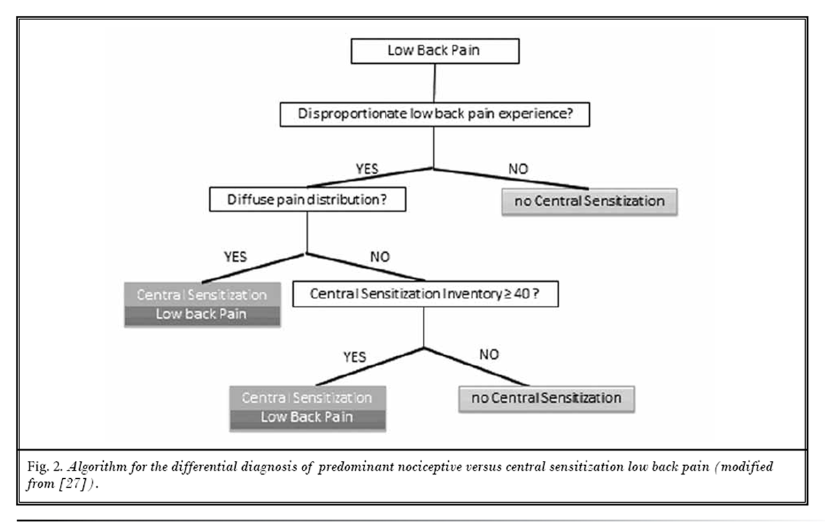 RESULTS: The first step implies examining the presence of neuropathic low back pain. Next, the differential diagnosis between predominant nociceptive and central sensitization pain is done using a clinical algorithm.