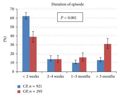 Disease-Specific Characteristics of LBP-Patients in Primary Healthcare. Only 16% (95% CI: 14%–18%) of the whole study population presented with a first episode of LBP and 52% (95% CI: 49%–55%) reported more than three previous episodes. Twenty-six percent (95% CI: 24%–29%) were sick listed and 5% (95% CI: 4%–6%) of these had been so for more than a week. There was a large proportion of patients who reported pain radiating to the leg: 58% (95% CI: 55%–61%) of patients in chiropractic practice and 68% (95% CI: 63%–74%) in general practice. Nevertheless, recovery expectations were generally high (median 9 (IQR 7–10) in chiropractic practice and 6 (IQR 3–9) in general practice) and expectations below 2 on a 0–10 scale were only seen in 54 cases in the combined cohort (2%; 95% CI: 1%–3% in chiropractic practice and 11%; 95% CI: 8%–15% in general practice).