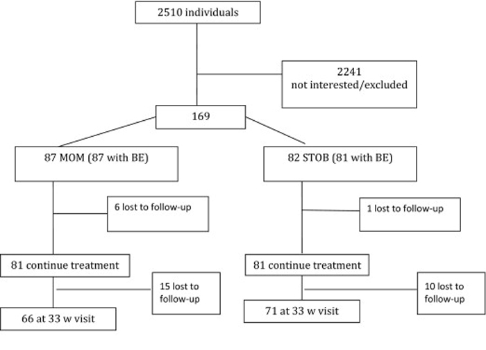 The study design is outlined in the Figure. Patients 1545 years old with a single fetus from 2428 weeks' gestation were evaluated by their obstetric provider for LBP, PP or both. Gestational age was calculated with a last menstrual period that corroborated with a first- or second-trimester ultrasound evaluation. Candidate patients with symptoms were screened by a dedicated study coordinator to identify exclusion criteria that included acute inflammatory disease, acute infectious disease, chronic back pain for >8 weeks before pregnancy, a mental health disorder, back pain from visceral disease, ongoing treatment for previous back pain, peripheral vascular disease, substance abuse, or litigation pending from back pain. Patients were not excluded if they had lower extremity neurologic symptoms or radiculopathy. A single, masked chiropractic specialist conducted the baseline evaluation (BE) with eligible volunteers before randomization. A blocked-randomization scheme was used across the 3 locations. With the use of an online Web Data Entry System that uses a computer-generated list of randomized numbers, subjects were allocated to the STOB group or the STOB plus multimodal musculoskeletal and obstetric treatment (MOM) group. [17, 18]