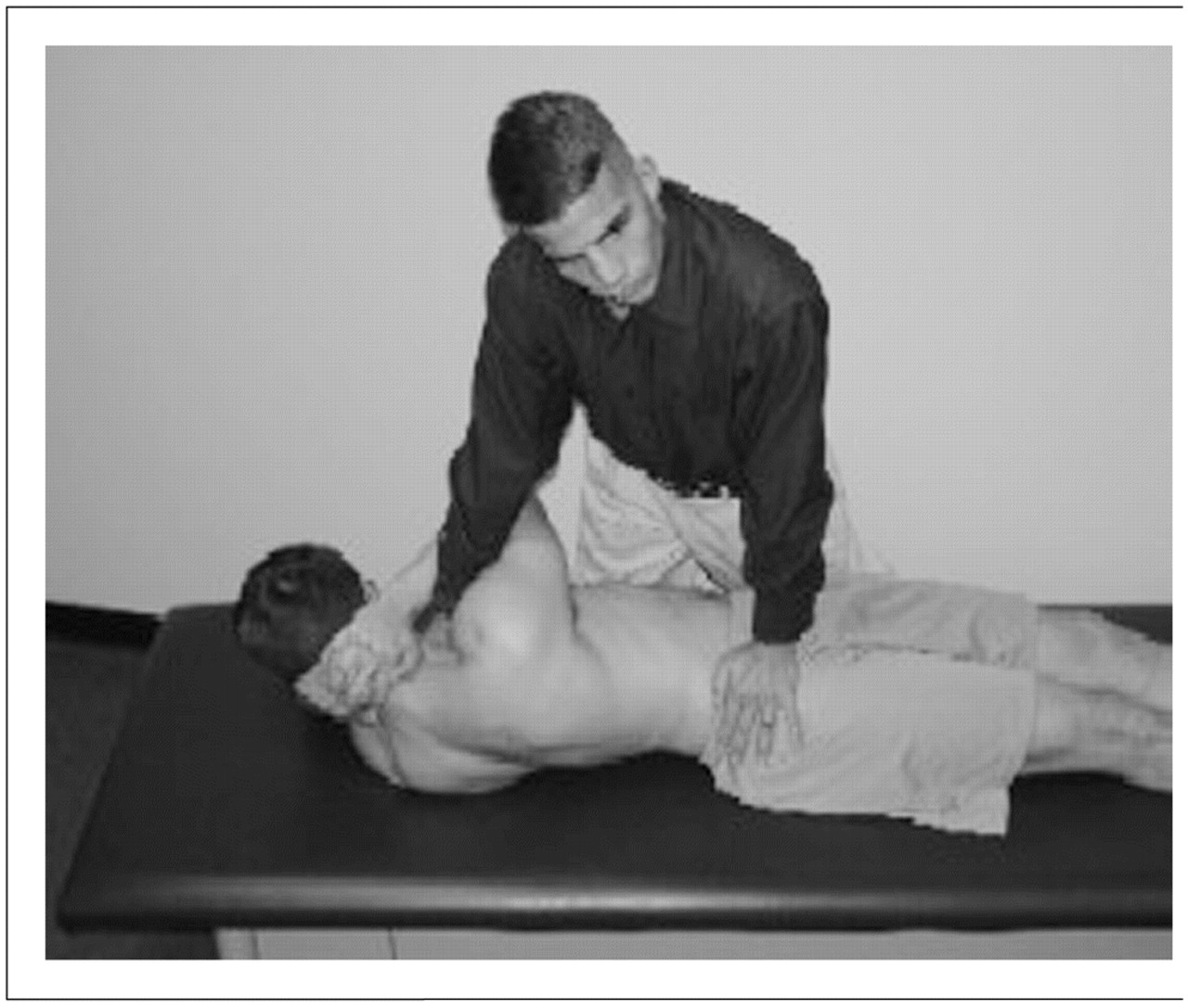 The treatment received by the manipulation group differed from that of the exercise group during the first 2 physical therapy sessions. During these 2 sessions, patients received high-velocity thrust spinal manipulation and a range-of-motion exercise only. First, the physical therapist performed the manipulation by using the same technique used by Flynn and colleagues  [17]. Appendix 2 describes and Figure 1 and Appendix 3 video illustrate the procedures used to perform the manipulation technique.