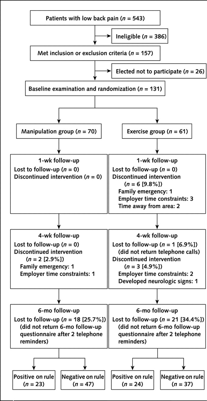 We recruited patients from 8 clinics in various U.S. regions from March 2002 through March 2003 (Figure 2). We screened 543 consecutive patients who were referred to physical therapy with symptoms of low back pain for inclusion. Of these, 386 did not meet all inclusion criteria. The most common reasons for exclusion were an ODQ score less than 30% (n = 202 [53%]) and age younger than 18 years or older than 60 years (n = 64 [17%]). Of 157 eligible patients, 26 elected not to participate (Figure 2) because of concerns about the time commitment (n = 19) or not wanting to be randomly assigned to 1 of the treatment groups (n = 7). The remaining 131 patients provided informed consent and were enrolled. We randomly assigned 70 patients to the manipulation group and 61 to the exercise group (Figure 2).
