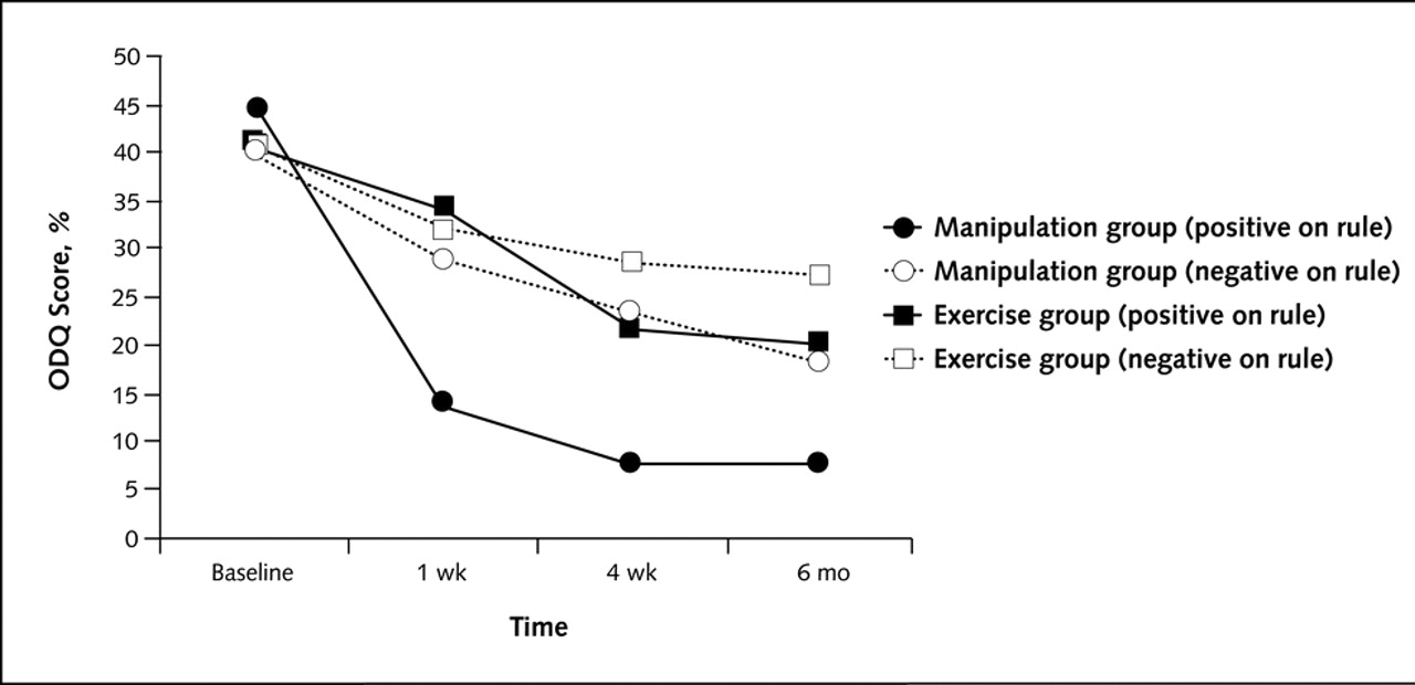 Current evidence supports only a few common interventions for patients with low back pain, including nonsteroidal anti-inflammatory medications  [39], advice to remain active  [40], and exercise  [41]. Conflicting results from randomized trials and systematic reviews on the effectiveness of manipulation suggest that while some patients respond rather dramatically, others may not experience much improvement. Previous studies that have not attempted to identify the subgroup of patients who are likely to benefit from manipulation have generally shown small treatment effects, leading to questions about the effectiveness of the intervention  [6]. Our results confirm that patients with low back pain who are likely to benefit from manipulation can be identified with increasing certainty. Patients who were positive on the rule and treated with manipulation had greater improvements in pain and disability after 1 and 4 weeks than patients who were positive on the rule and received exercise intervention and patients who were negative on the rule and received manipulation. These results were maintained at the 6-month follow-up. A patient's status on the rule was of little relevance in determining the outcome of patients treated with the exercise intervention. These findings support the hypothesis that the rule is valid for identifying patients with low back pain who are likely to respond rapidly to manipulation.