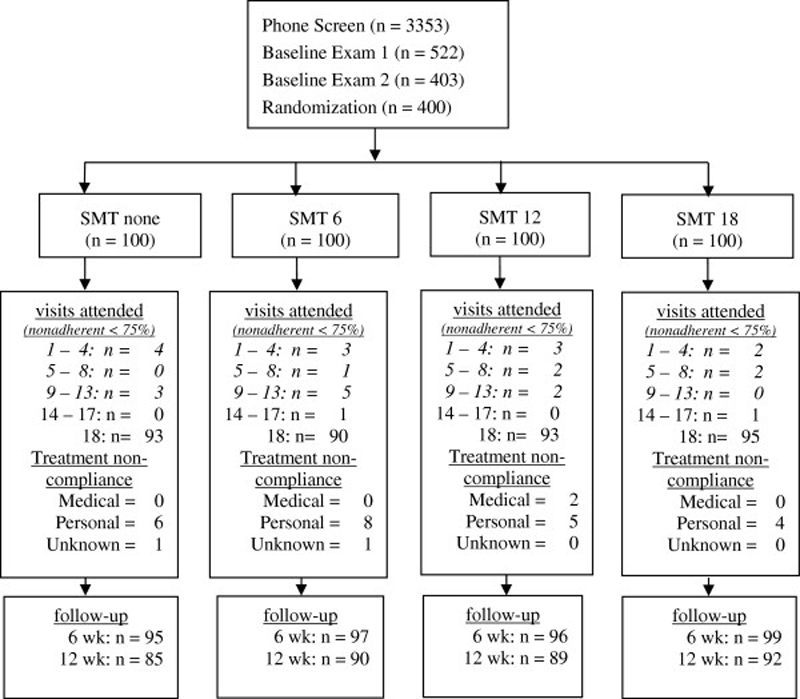 The study is presented in detail in the principal report of outcomes. [15] In a prospective open-label, randomized controlled trial, 400 participants with chronic LBP were randomized to receive a dose of 0, 6, 12, or 18 sessions of SMT from a chiropractor. The protocol called for all participants to attend 18 visits, three per week for six weeks. At non-SMT visits, a brief, light massage control was performed to control provider attention and touch by the chiropractor. That is, the number of control visits equaled 18 minus the number of SMT visits. The study was conducted in the Portland, Oregon metropolitan area between March 2007 and July 2011.