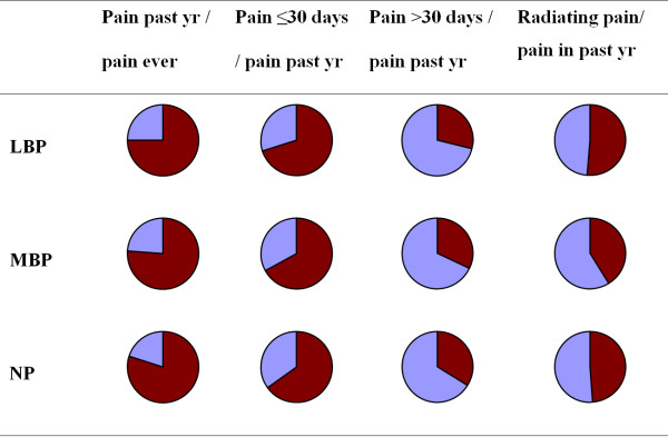 The proportions of those having had back pain the past year among those who reported having had back pain ever were fairly similar for the three spinal regions ranging between 75% (for LBP) and 80% (for NP) (Figure 1, first column).