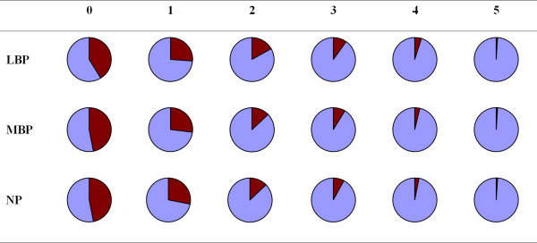 As can be seen in Table 1 the prevalence estimates of LBP, MBP and NP differ considerably; with LBPever and LBPyear being the most frequently reported disorder followed by NPever and NPyear. MBPever and MBPyear were least common.