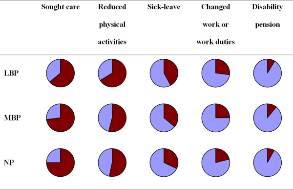 People with LBP were generally somewhat more likely than others to report consequences irrespectively of the pain duration, except for 'care-seeking' in which NP and MBP were somewhat more commonly reported. However, the same hierarchy and patterns of consequences were noted regardless of the pain duration (data not shown).