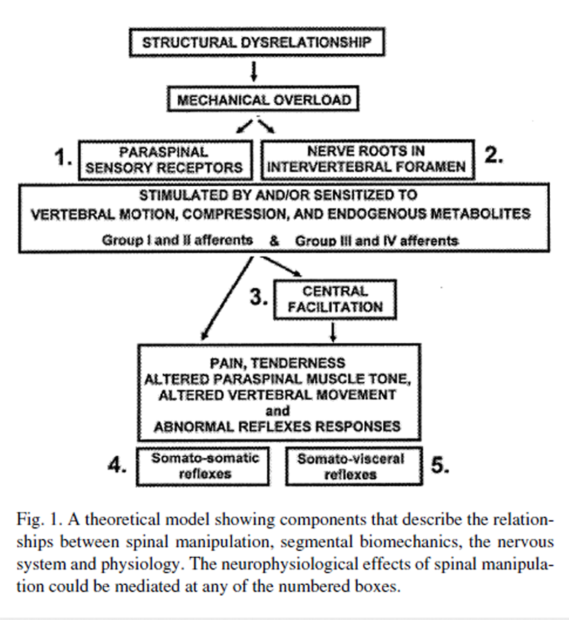 METHODS:        This review article draws primarily from the peer-reviewed literature available on Medline. Several textbook publications and reports are referenced. A theoretical model is presented describing the relationships between spinal manipulation, segmental biomechanics, the nervous system and end-organ physiology. Experimental data for these relationships are presented.