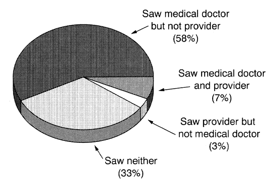 The vast majority of respondents (83 percent) reported one or more principal medical conditions in 1990. More than half (58 percent) of respondents with at least one principal medical condition saw a medical doctor but not a provider of unconventional therapy in 1990; 3 percent saw only a provider of unconventional therapy; 7 percent saw both a medical doctor and a provider of unconventional therapy; and 33 percent saw neither for at least one principal medical condition  [Figure 1].