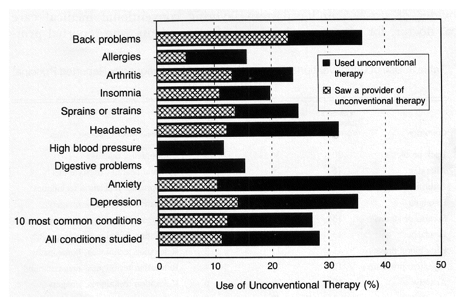 Studies based on samples in limited geographic areas suggest that the use of unconventional therapy is widespread. [3–5] In particular, unconventional therapies are frequently used by patients with cancer,  [6–11] arthritis,  [11–13] chronic back pain,  [3, 14] the acquired immunodeficiency syndrome,  [15] gastrointestinal problems,  [16, 17] chronic renal failure,  [18] and eating disorders. [19] Little is known, however, about the overall prevalence, cost, and patterns of use of unconventional therapy in the United States. [1, 20]