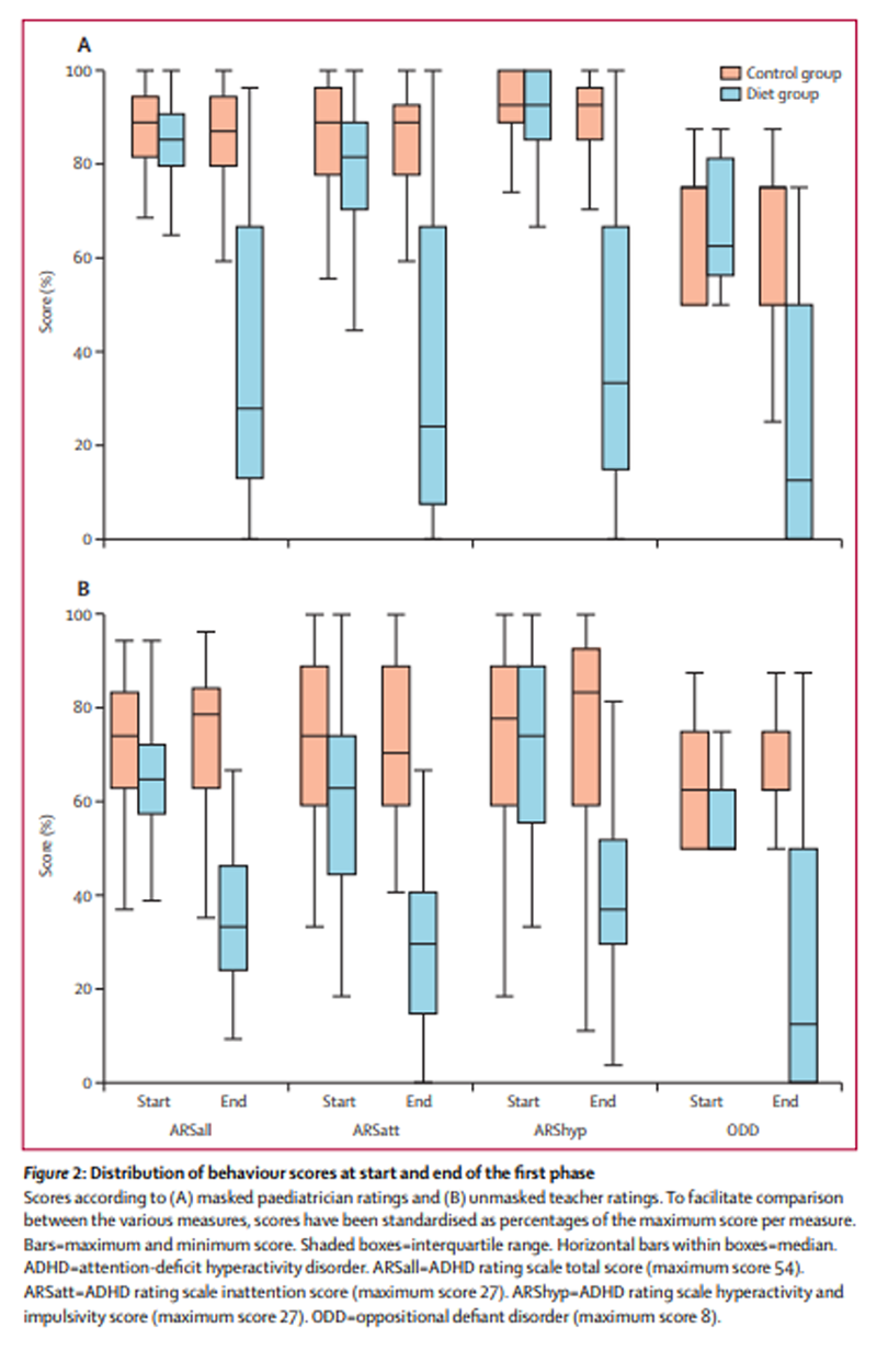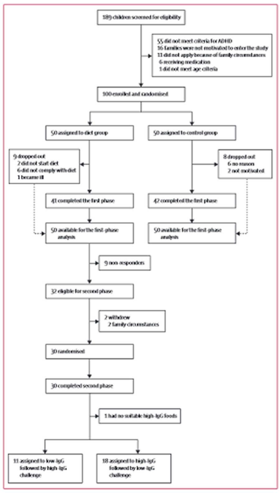 Methods The Impact of Nutrition on Children with ADHD (INCA) study was a randomised controlled trial that consisted of an open-label phase with masked measurements followed by a double-blind crossover phase. Patients in the Netherlands and Belgium were enrolled via announcements in medical health centres and through media announcements. Randomisation in both phases was individually done by random sampling. In the open-label phase (first phase), children aged 4—8 years who were diagnosed with ADHD were randomly assigned to 5 weeks of a restricted elimination diet (diet group) or to instructions for a healthy diet (control group). Thereafter, the clinical responders (those with an improvement of at least 40% on the ADHD rating scale [ARS]) from the diet group proceeded with a 4-week double-blind crossover food challenge phase (second phase), in which high-IgG or low-IgG foods (classified on the basis of every child's individual IgG blood test results) were added to the diet. During the first phase, only the assessing paediatrician was masked to group allocation. During the second phase (challenge phase), all persons involved were masked to challenge allocation. Primary endpoints were the change in ARS score between baseline and the end of the first phase (masked paediatrician) and between the end of the first phase and the second phase (double-blind), and the abbreviated Conners' scale (ACS) score (unmasked) between the same timepoints. Secondary endpoints included food-specific IgG levels at baseline related to the behaviour of the diet group responders after IgG-based food challenges. The primary analyses were intention to treat for the first phase and per protocol for the second phase. INCA is registered as an International Standard Randomised Controlled Trial, number ISRCTN 76063113.