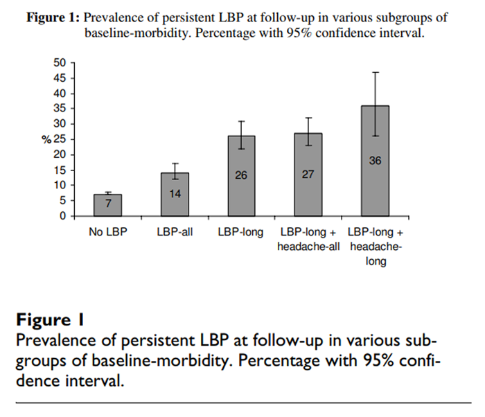 Conclusion:     Young people from 12 to 22 years of age with persistent LBP during the previous year have an odds ratio of 3.5 persistent LBP eight years later. Both headache and asthma are also positively associated with future LBP and there is a large clustering of LBP, headache and asthma in adolescence.