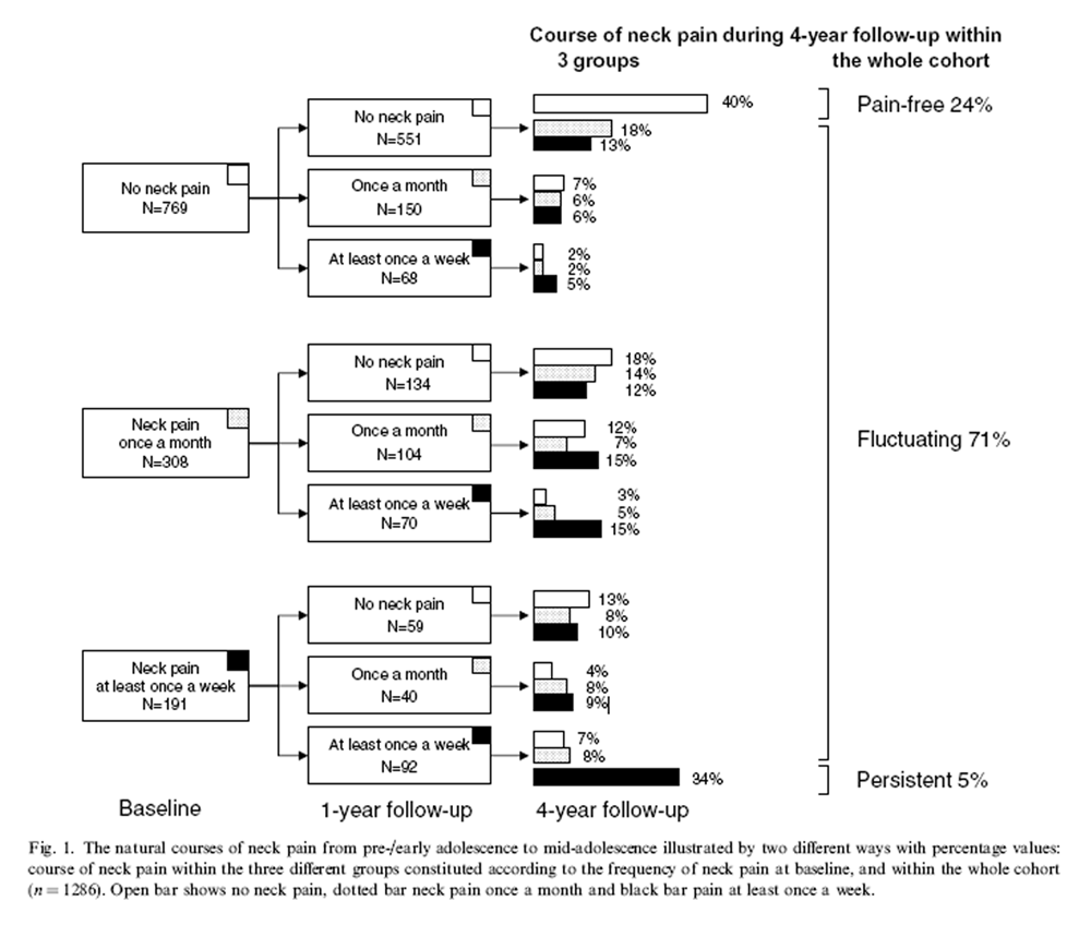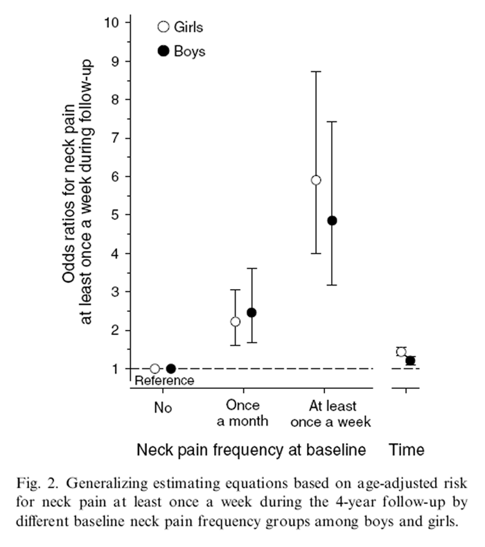 Stahl M, Mikkelsson M, Kautiainen H, Hakkinen A, Ylinen J, Salminen JJ. Neck pain in adolescence. A 4-year follow-up of pain-free preadolescents.