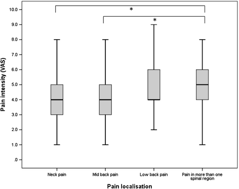 The first aim of this survey was to provide data on intensity, frequency and localization of adolescent spinal pain as well as its consequences on daily life. [9] Pain intensity was reported on average as moderate, which is in line with former studies using the VAS for pain quantification [14, 25], but higher than in a study that assessed pain intensity by six faces as suggested in the Young Spine Questionnaire [9] and rescaled it to a 0–10 scale. [26] Which of these two approaches to assess pain intensity in adolescents is preferable however needs further investigation as it might be dependent on age.