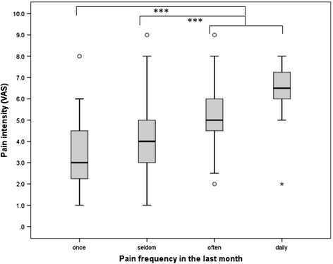 Non-recurrent pain was experienced on average as mild (3.4 ± 1.7 VAS points), occasional (seldom/at few days) (3.9 ± 1.4 VAS points) and frequent (often/at several days) pain (5.4 ± 1.5 VAS points) as moderate, while daily pain was severe (6.3 ± 1.6 VAS points).
