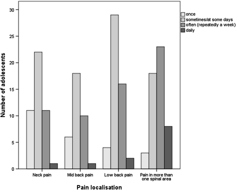 Based on the results of this study, data on pain intensity need to be complemented by data on pain frequency and pain localization in order to give a comprehensive picture of the severity of an adolescent back problem. Milanese and Grimmer identified in their review three categories of LBP in literature, namely general LBP (no characterization of LBP), chronic/recurrent LBP (characterized by a measure of recurrence) and severe/disabling LBP (characterized by a measure of severity), that might have different risk factors. [32] The results of this study suggest that these categories also need to be studied in combination. In terms of the description of adolescent spinal pain in general, particularly pain localization in more than one spinal area should be recorded.