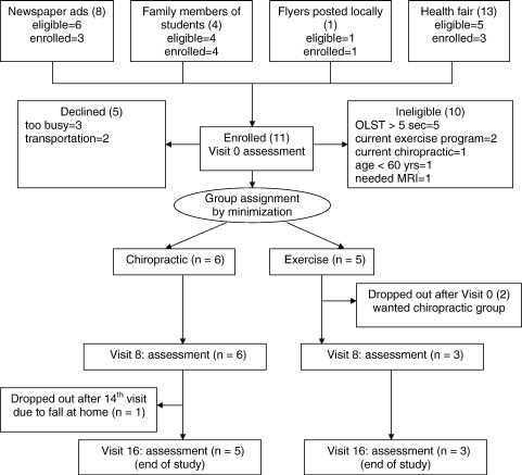 We screened volunteers for preliminary eligibility by phone and/or at off-site events. If eligible, they presented to the clinic; and the coordinator verified preliminary eligibility, explained the study, and obtained informed consent. An assessor conducted the BBS and the OLST to determine the second level of eligibility (able to stand on one leg for <5 seconds). If eligible, the patient was examined by the treating clinician to verify final eligibility, at which point he or she was assigned to a treatment group (see below for allocation scheme).