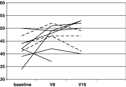 Scheduling required that different assessors conducted the BBS for 4 patients out of the total of 9. Figure 2 graphically illustrates the BBS scores over time, at V0, V8 (1 month from baseline), and V16 (the final visit, 2 months from baseline). Improvement was apparent for most patients at V8, without additional substantial change observed at V16.