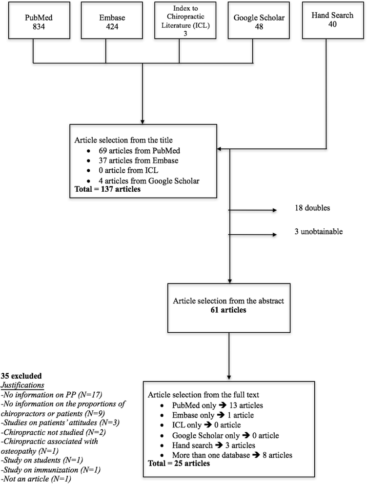Information had to be present on: PP in relation to information on chiropractors’ opinions of the use of PP, and/or the percentage of chiropractors who reported using PP, and/or the percentage of patients who consult for PP in chiropractic practice or in a chiropractic student clinic.