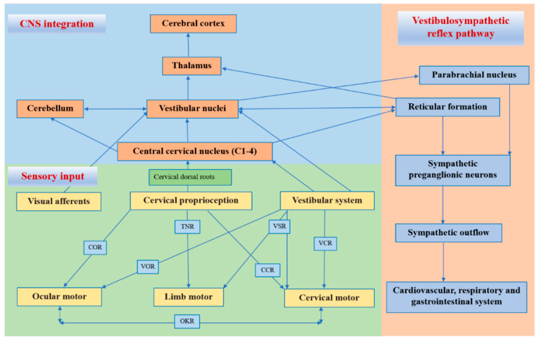 The cervical proprioceptive system has unique central and reflex connections with the vestibular and visual systems (Figure 1). It is well recognized that the convergence of cervical proprioceptive afferents with vestibular and visual inputs at different levels of neuroaxis includes the vestibular nuclei, thalamus, and cerebral cortex. [10, 16, 29, 32–34] Animal studies suggest that cervical proprioceptive afferents are transmitted to the central cervical nucleus through the dorsal root ganglion and project directly to the vestibular nucleus. [35] Neurons in the central cervical nucleus receive afferent information from the vestibular and cervical proprioceptors and provide integrated data about the head position relative to the trunk and space to the cerebellum and reticular formation. [36, 37] The spinal cord can also indirectly convey input to the vestibular nuclei via the cerebellum and reticular formation. [38] Moreover, the vestibular nuclei can provide direct inputs to the reticular formation and parabrachial nucleus with projections to sympathetic preganglionic neurons of the thoracic spinal cord, which are involved in producing the rapid adjustment of circulation, digestion, and respiration necessary to maintain homeostasis (through the vestibulo-sympathetic reflex pathway). [39, 40] Reflex activities relating to the cervical, vestibular, and visual systems play a significant role in the coordination of head, neck, and eye movements (Figure 1).