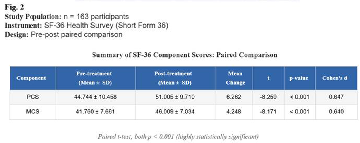 One hundred and sixty-three patients completed all three SF-36v2 questionnaires over the three months. Pre and Post treatment result show improvement in all parameters (Figure 1). The statistical analysis demonstrated highly statistically significant (p<0.001) changes for both physical and mental components. Among participants, the mean PCS score increased from 44.7±10.5 at baseline to 51.0±9.7 at 3 months. The mean MCS score increased from 41.8±7.7 to 46.0±7.0 over the same period (Figure 2). Wilcoxon signed-rank tests confirmed that changes in both PCS and MCS were highly significant (p<0.001).