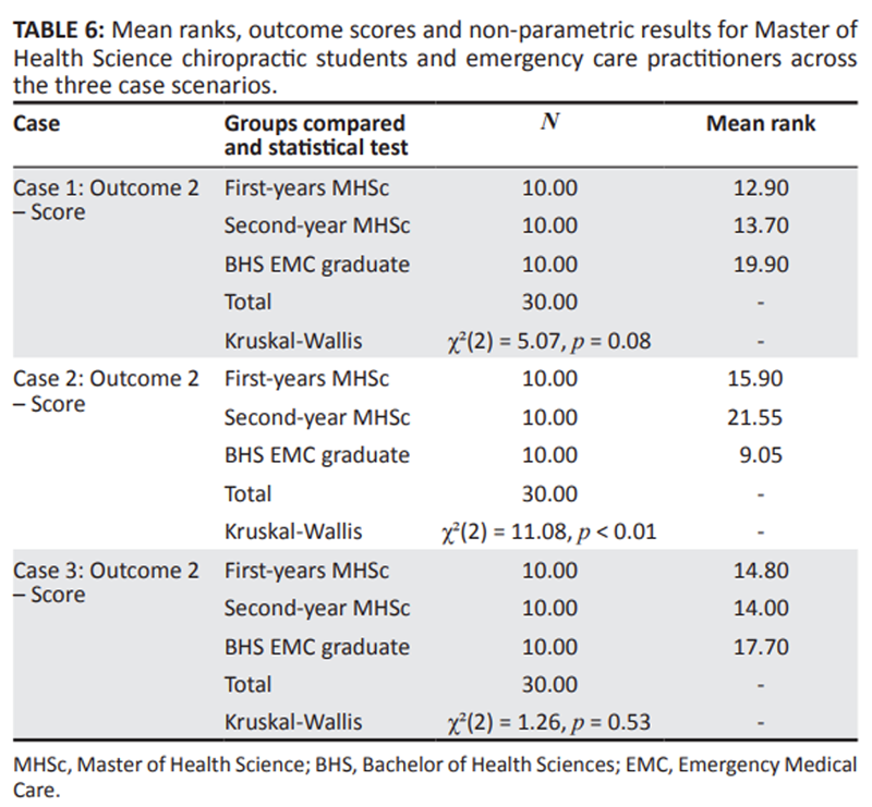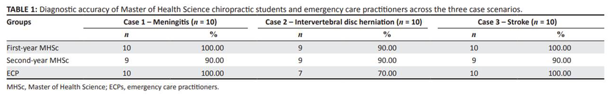 Aim: To compare the diagnostic abilities of Master of Health Science (MHSc) chiropractic students and ECPs in distinguishing MSK from emergency conditions.