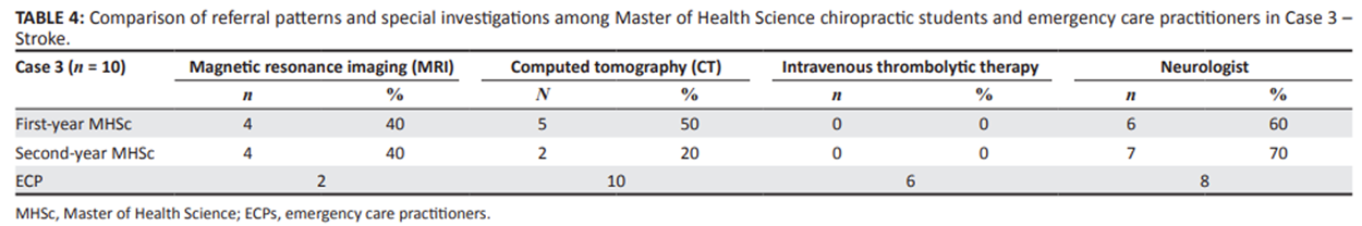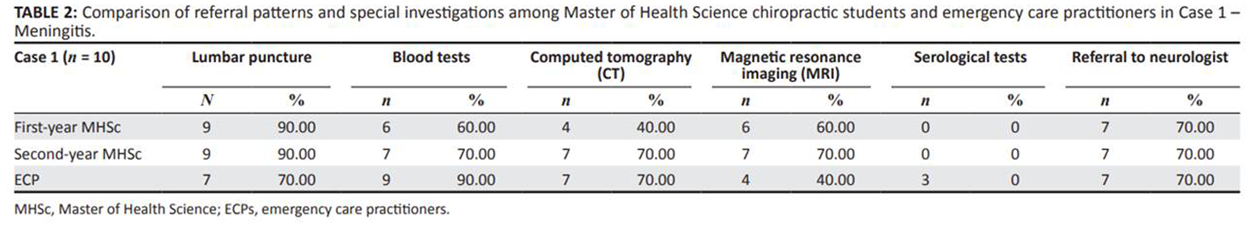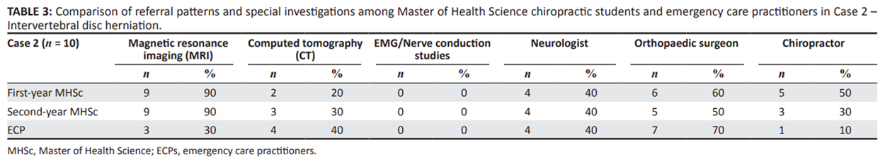 Results: Second-year MHSc students outperformed ECPs in the clinical management of a disc herniation case (Case 2; p < 0.01). Diagnostic accuracy was high (> 90%) for meningitis and stroke across all groups. Differences in investigation preferences emerged, with chiropractic students favouring advanced imaging and ECPs recommending more basic tests. No significant performance differences were found in the other two cases.