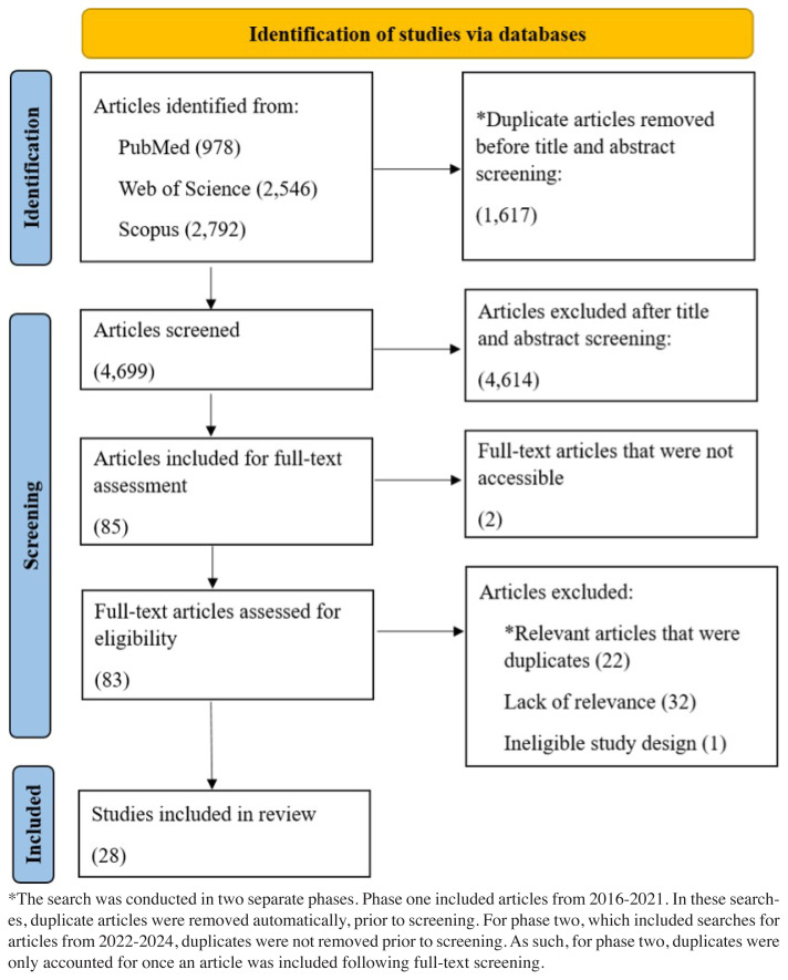 One author assessed titles and abstracts of identified articles to determine eligibility. Articles deemed potentially relevant underwent full-text review by the same author. The rest of the working group confirmed inclusion of each full-text article.