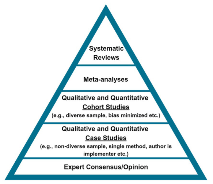 We conducted a narrative review [6] to summarize contemporary iterations, contextual factors, and limitations of evidence hierarchies by examining published scholarly literature on the evidence pyramid in relation to EBP.