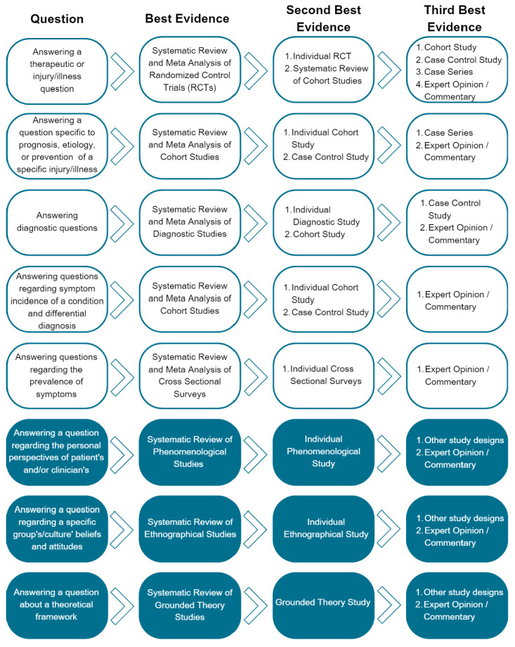 Although clinical research relies heavily on quantitative research methods, [39, 43] the broader methodological literature should also be considered, including qualitative and mixed methods research. These methodologies have traditionally been excluded from the evidence pyramid, despite that certain clinical questions may be best answered using these approaches. [24]